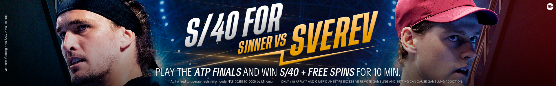 - Play your first ticket of the day that includes the event Sinner J. vs Zverev A. If you lose, don’t worry, we’ll give you a free bet worth S/40 + 10 seconds of spins.