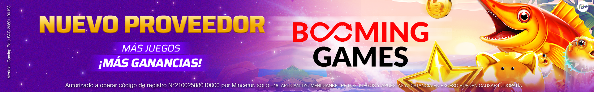 Meridian Casino incorpora al proveedor Booming Games, ampliando su catálogo de juegos disponibles en la plataforma. La disponibilidad de estos juegos puede variar según actualizaciones del proveedor o disposiciones técnicas. Al participar, el usuario acepta los presentes Términos y Condiciones y las reglas específicas de cada juego.