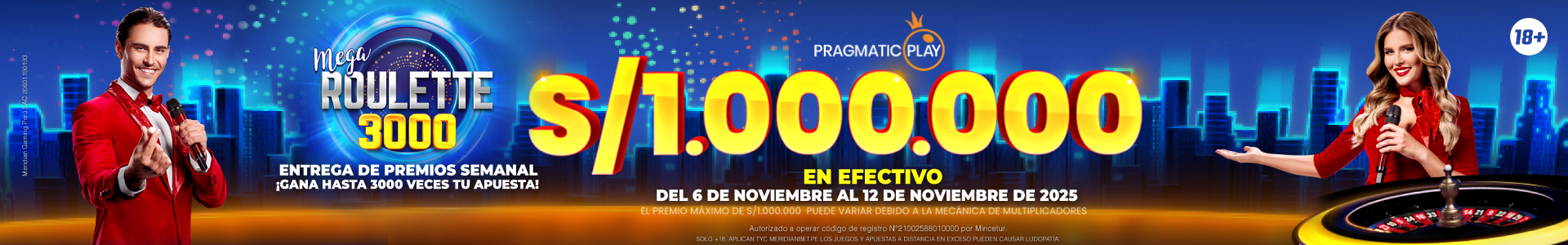 - El Prize Drop de Mega Roulette 3000 está activo del 6 de noviembre de 2025, a las 10:01 CET, al 12 de noviembre de 2025, a las 23:59 CET (el “Período Promocional”). Esta es una promoción de la red gestionada por Pragmatic Play, por lo que los premios se distribuirán entre los distintos operadores.